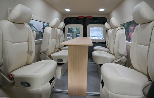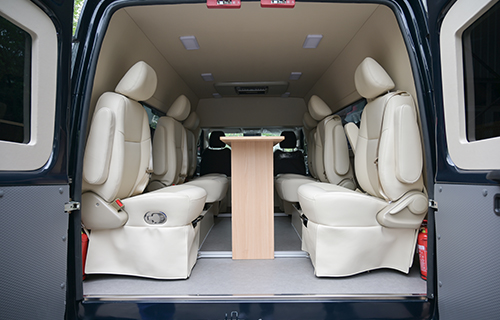 座椅采用縱向布局,裝載量大;五點(diǎn)式安全帶保證車內(nèi)人員乘坐安全;