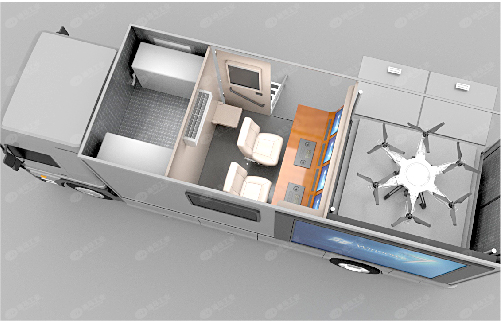 迪馬工業(yè)研制的新型系列化無(wú)人機(jī)察打一體型集救援裝備運(yùn)載型器材車,本著“先進(jìn)、實(shí)用、穩(wěn)定、高效”的原則,遵循簡(jiǎn)捷、安全、可靠的建設(shè)理念,以滿足當(dāng)前應(yīng)急救援部門對(duì)應(yīng)急事件快速反應(yīng)和裝備快速到位的實(shí)際需求,配置有:多功能拖車鉤、維修工具、警示系統(tǒng)、通信模塊、電源模塊、運(yùn)輸模塊、無(wú)人機(jī)飛控模塊、環(huán)境調(diào)節(jié)模塊、照明模塊、自動(dòng)充電、充氣模塊、越野能力模塊等,可對(duì)整個(gè)系統(tǒng)進(jìn)行控制,一鍵就緒、一鍵復(fù)位、緊急停止,具備遠(yuǎn)程控制功能。
